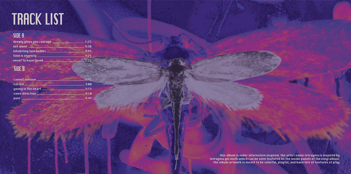 By using a randomized name for the album and band, I was able to use imagery that would play along. One of them being the Tetragma gei moth, which you can see featured on the inside panels of the vinyl album. I also chose indie/alternative as my genre for this band, so primarily did visual research keeping that genre in mind.
